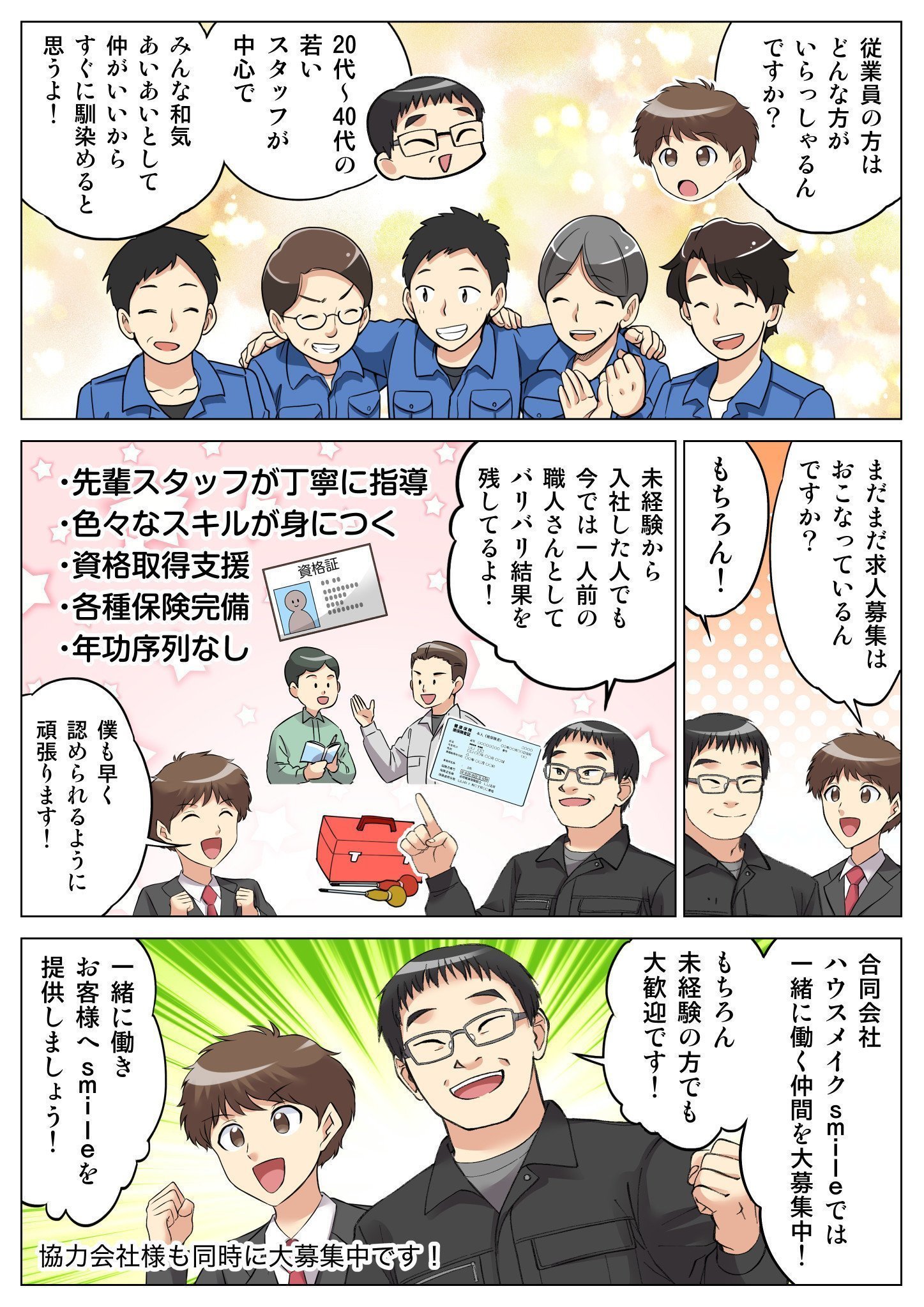 リフォームを通して、お客様を笑顔にするために社員達も日々努力し成長していける会社です!現場で働く方々も社員も笑顔で工事をし、その中で現場の事を学んでいけるので未経験の方も安心して入社して下さい!社名にもSmileとあるようになによりも笑顔を大切にしてますので明るく楽しく一緒に働きましょう!